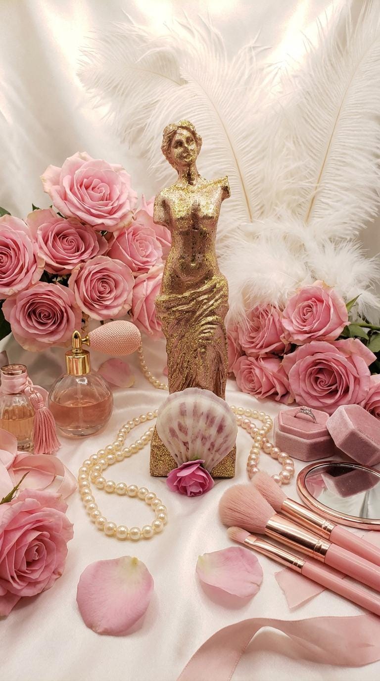Need a statue for your Aphrodite altar? We have both plaster and resin and various colors to choose from. Upon purchase you will receive a 6-inch plaster figure with the seashell and the faux roses attached! if you would like a different color or glitter color feel free to message me :) I'm nice and I don't bite.