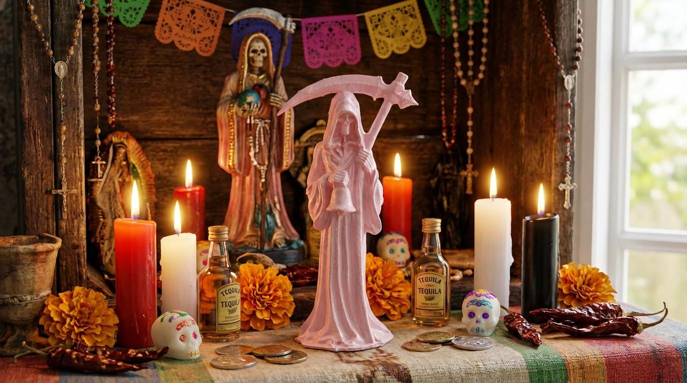 Santa Muerte, or Holy Death, is a folk saint venerated primarily in Mexico and parts of the U.S. She is associated with death, protection, and the fulfillment of prayers, particularly among marginalized communities. Often depicted as a skeletal figure in a robe, she holds symbols like a scythe (representing the cycle of life and death) and a globe (symbolizing her power over the world).