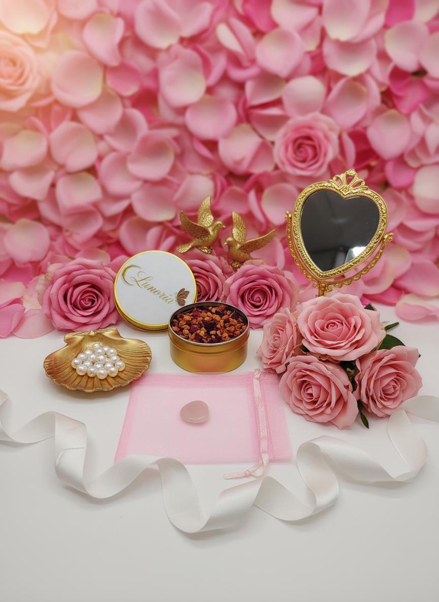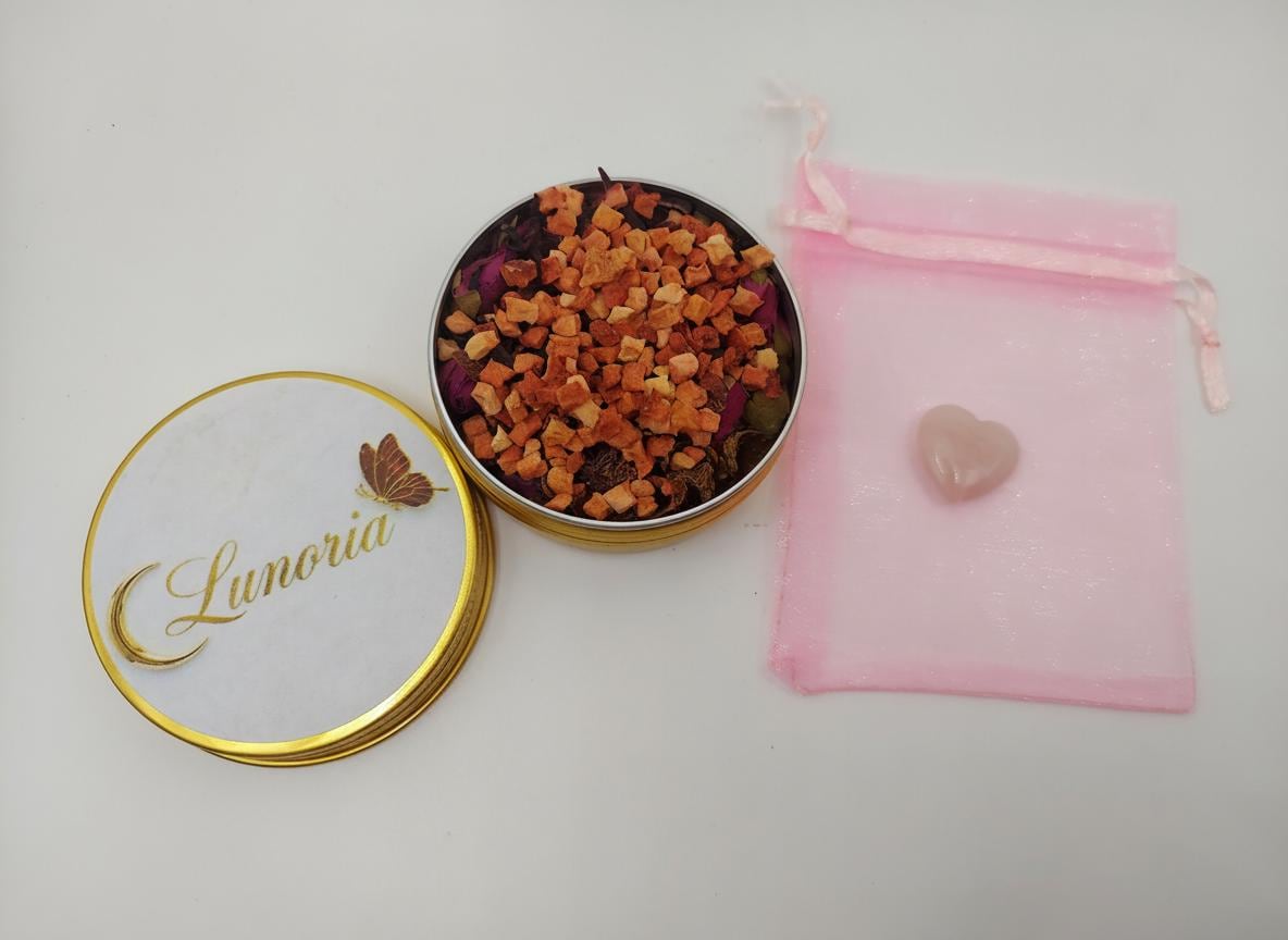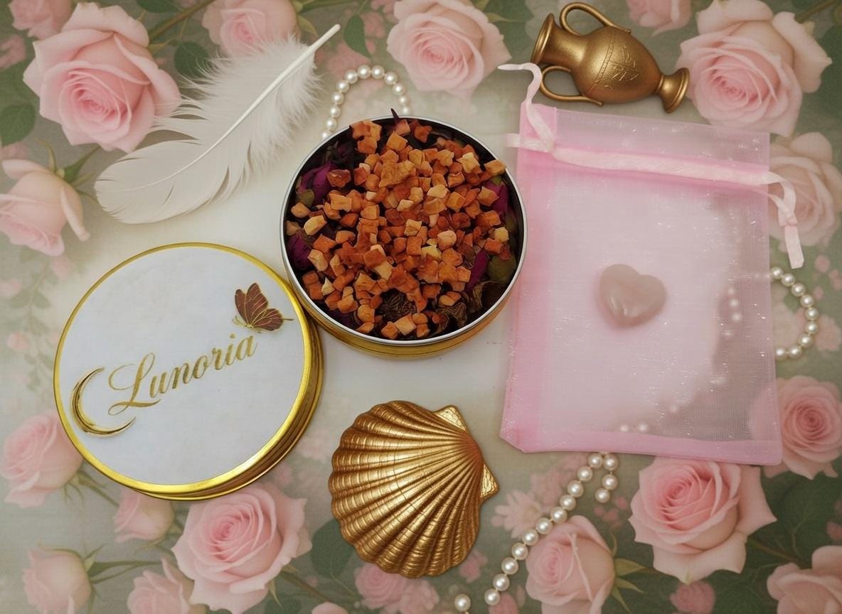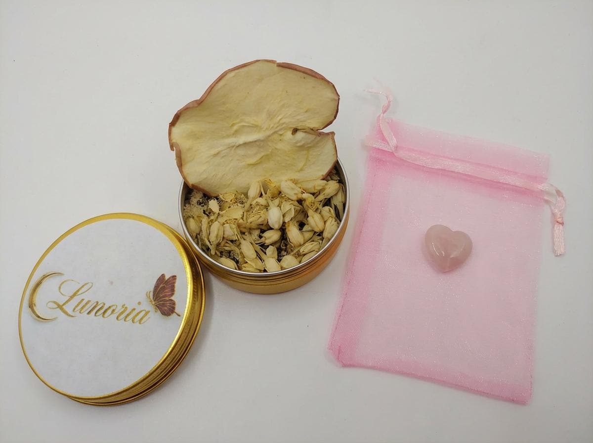 Two different Aphrodite teas in a gold-colored 2-oz tin. Perfect for a tea ritual to connect with Aphrodite or as an offering to her. Contains tea and a rose quartz heart