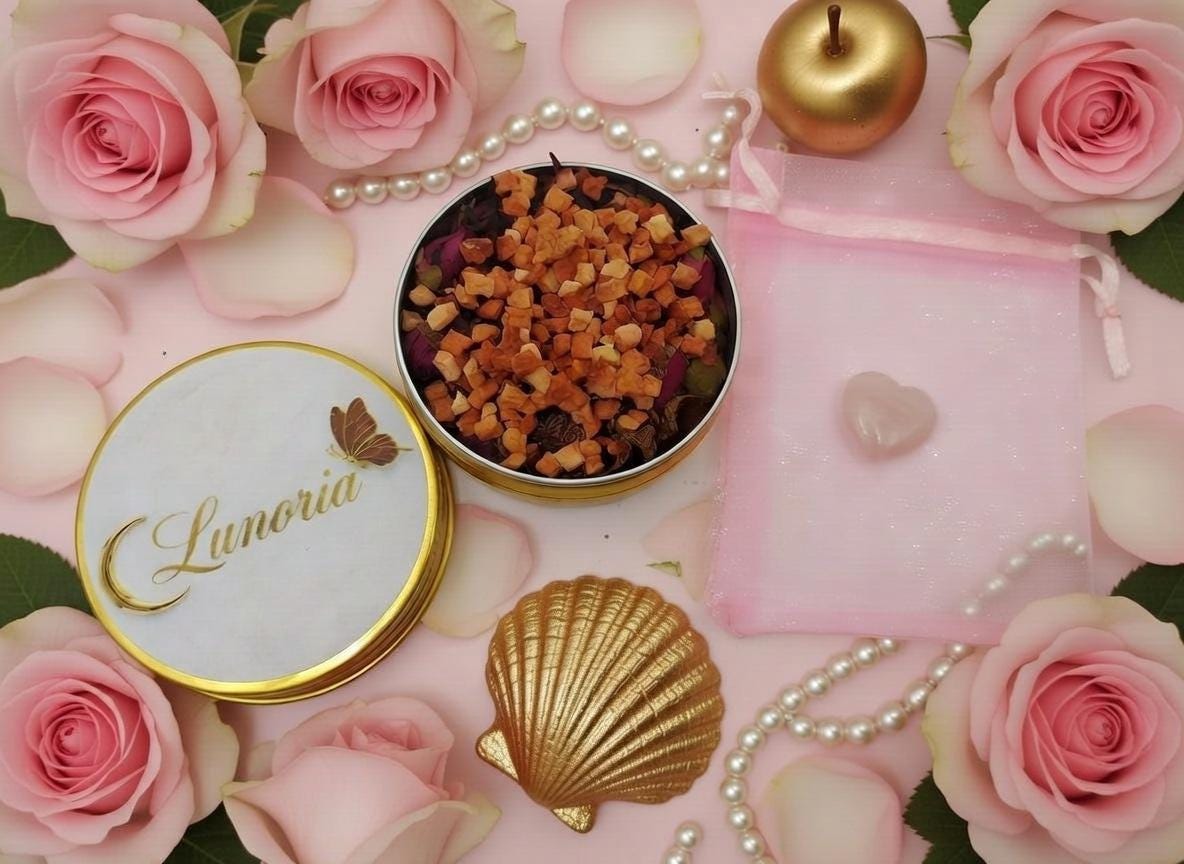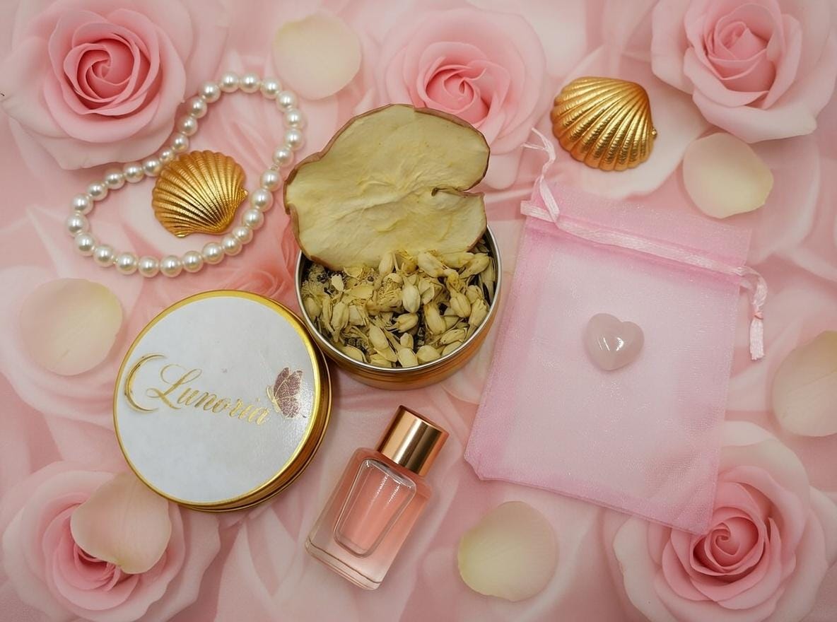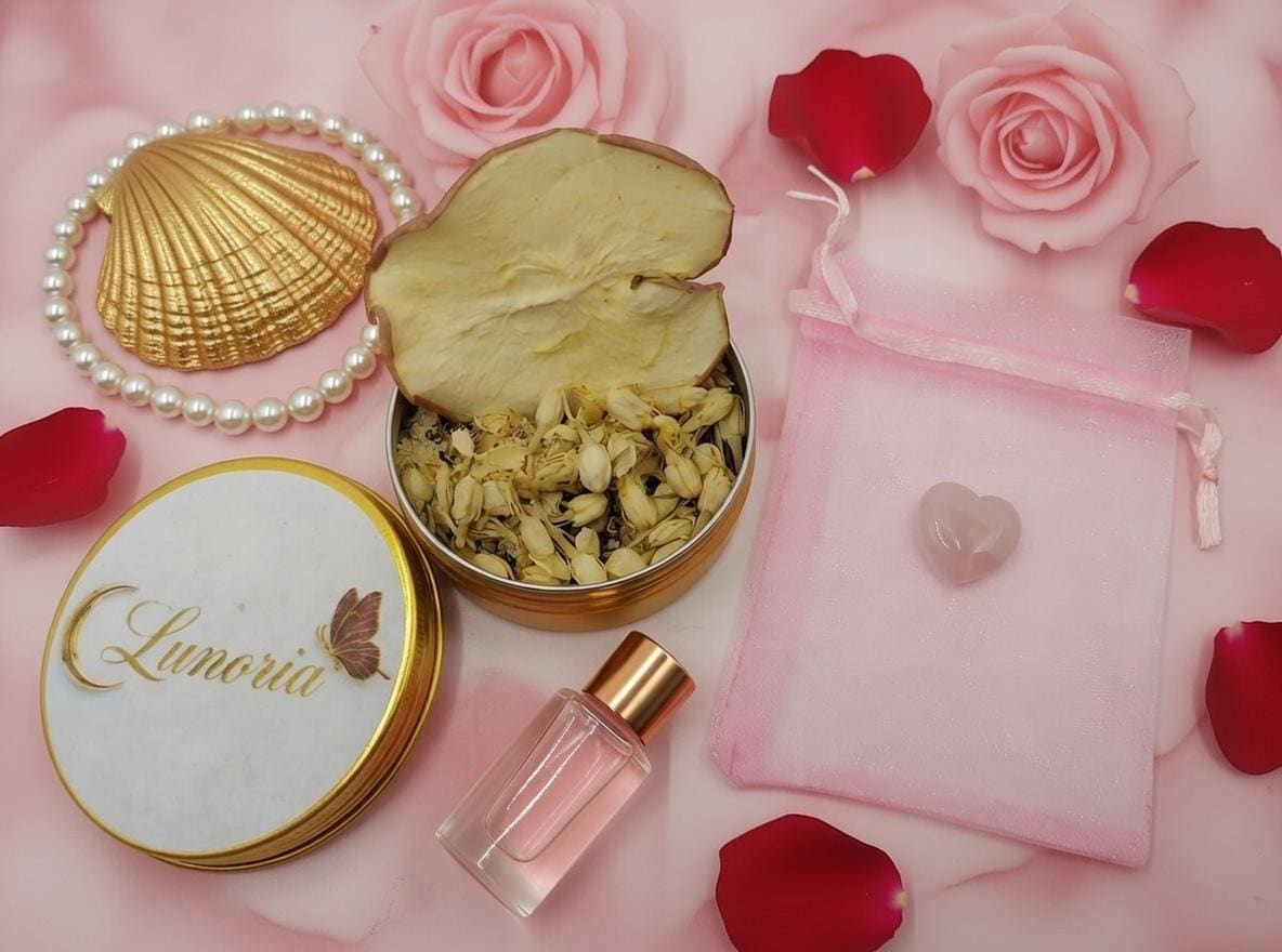 Two different Aphrodite teas in a gold-colored 2-oz tin. Perfect for a tea ritual to connect with Aphrodite or as an offering to her. Contains tea and a rose quartz heart
